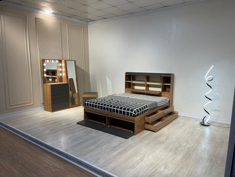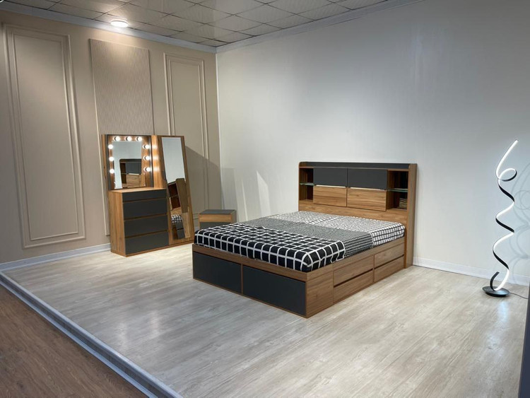سنسور نور لمسی: یکی از جذابترین امکانات این سرویس، سنسور نور تعبیهشده در کلگی تخت و میز آرایش است که به شما امکان روشن و خاموش کردن نور را تنها با لمس میدهد. این قابلیت هم ظاهری لوکس و هم کاربری آسان را فراهم میکند.