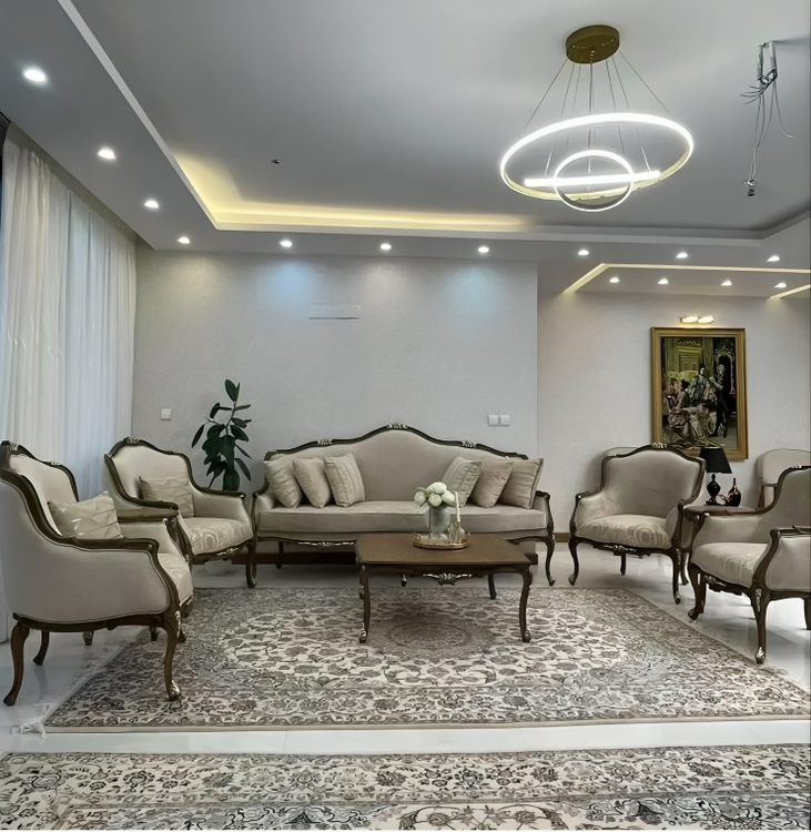 - ست میز جلو مبلی همجنس با پایههای خمیده کلاسیک برای حفظ هارمونی در فضا