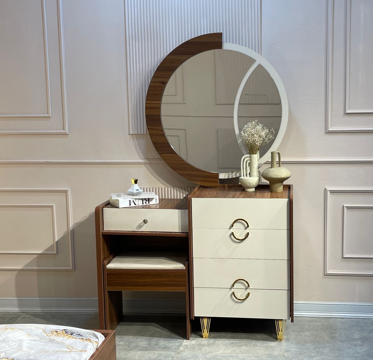 میز آرایش شیک همراه با آینه دکوراتیو که هم کاربردی است هم تزئینی