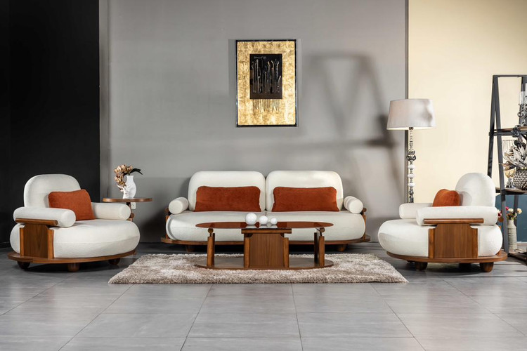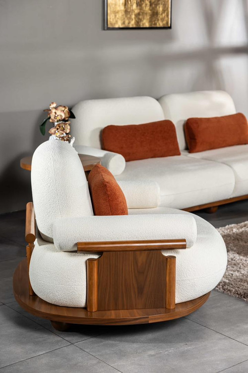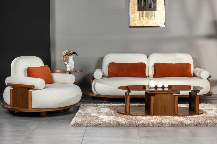 مبلمان پاندا با ترکیب جذاب پارچه نارنجی و سفید در کنار چوب راش طبیعی، جلوهای خاص و متفاوت به فضای نشیمن میبخشد 🍊🤍