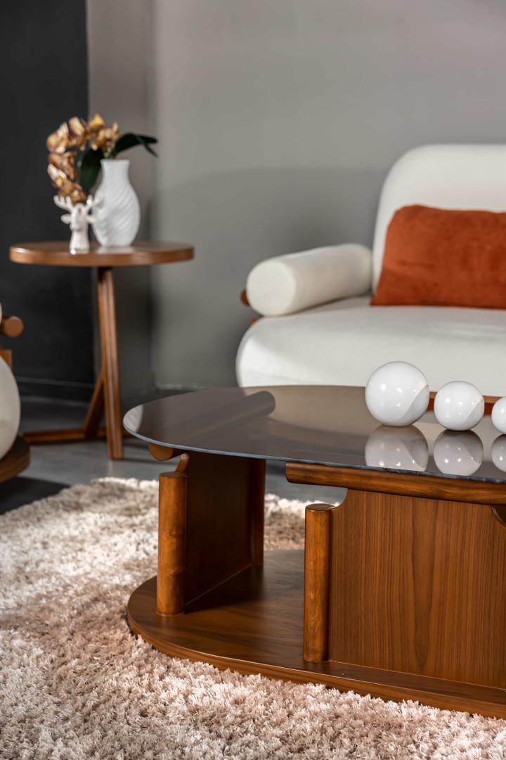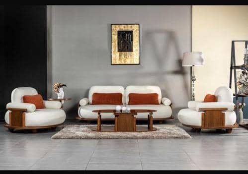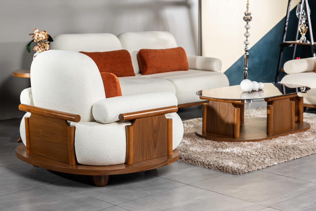 مبلمان پاندا با ترکیب جذاب پارچه نارنجی و سفید در کنار چوب راش طبیعی، جلوهای خاص و متفاوت به فضای نشیمن میبخشد 🍊🤍