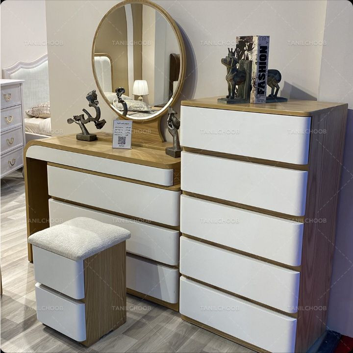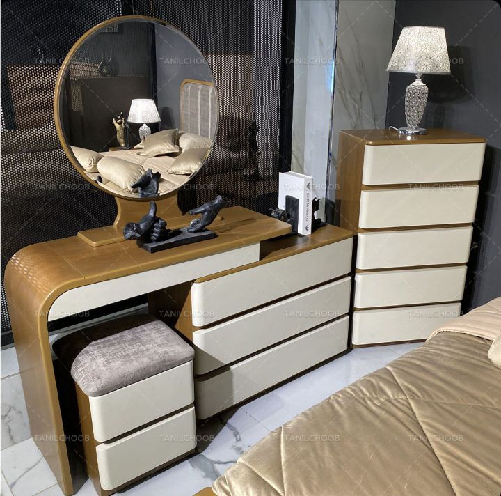 میز آرایش این سرویس خواب به صورت دو تکه اجرا شده است و قابل تنظیم میباشد و با کشو هایی که در آن کار شده ، فضای بسیار زیادی را در اختیار شما می گذارد .