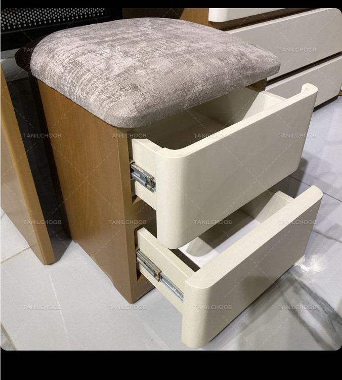 کنار تختی طراحی شده برای این سرویس خواب از دو کشوی جادار تشکیل شده است و حتی صندلی میز آرایش این سروس نیز دارای کشو میباشد.