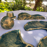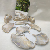 سفرههای هفت سین نقرهای با پتینه طلایی مدل برگ، مناسب برای تزئین و برگزاری مراسم نوروزی. این ست زیبا و منحصر به فرد با هنر دستی و دقت فراوان ساخته شده است تا جلوهای خیرهکننده و مجلل به سفرههای هفت سین شما ببخشد.